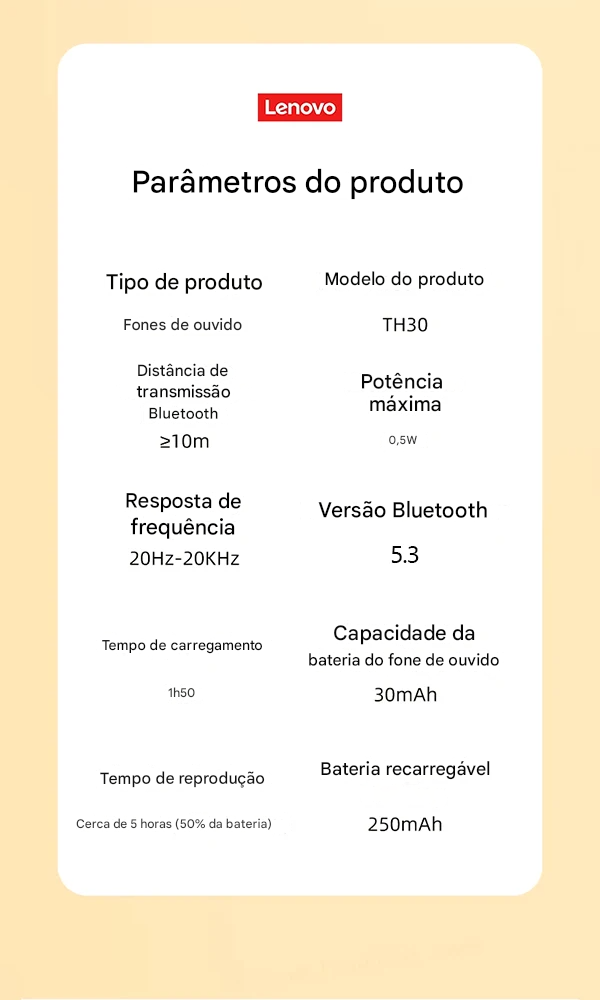 đ§ Fone de Ouvido Lenovo TH30 Bluetooth - Liberdade Sonora Premium