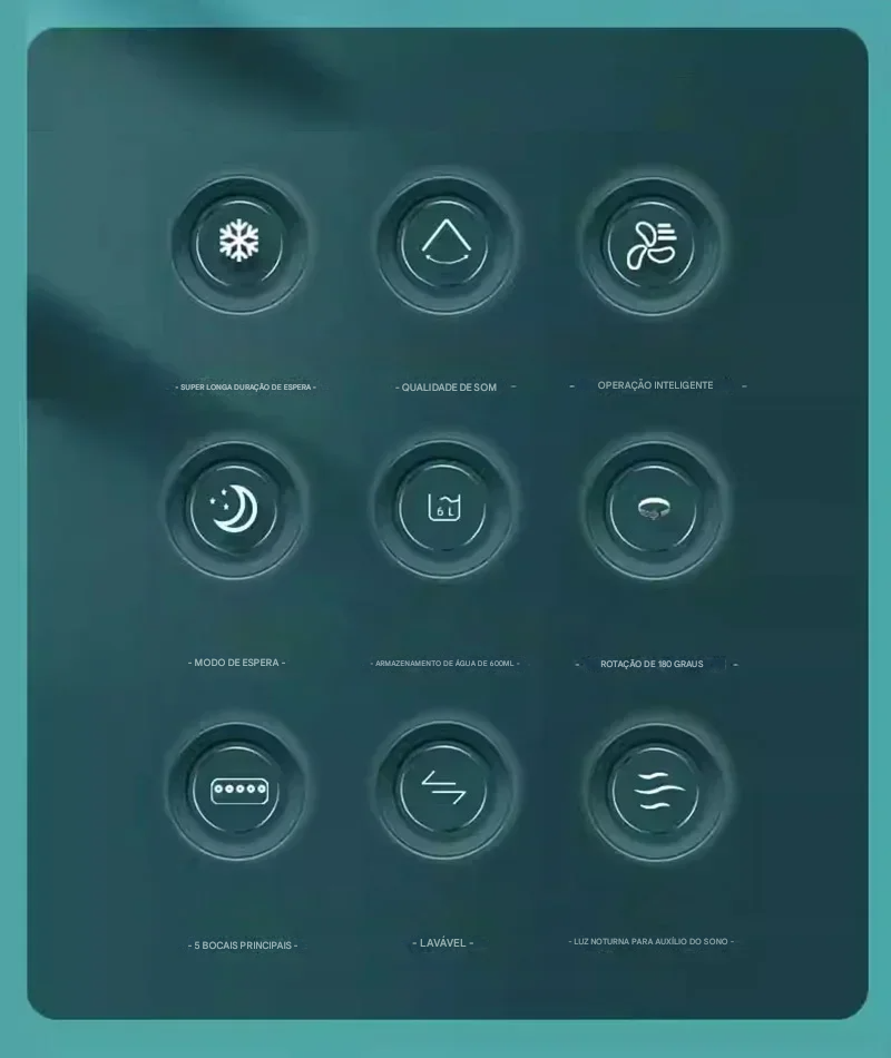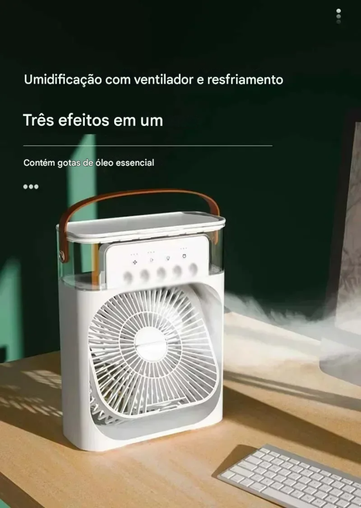 O Ventilador Multifuncional de Umidificação 3 em 1 não é só mais um ventilador. É o primeiro sistema portátil que realmente TRANSFORMA o ar ao seu redor, combinando três tecnologias em um único dispositivo compacto: